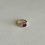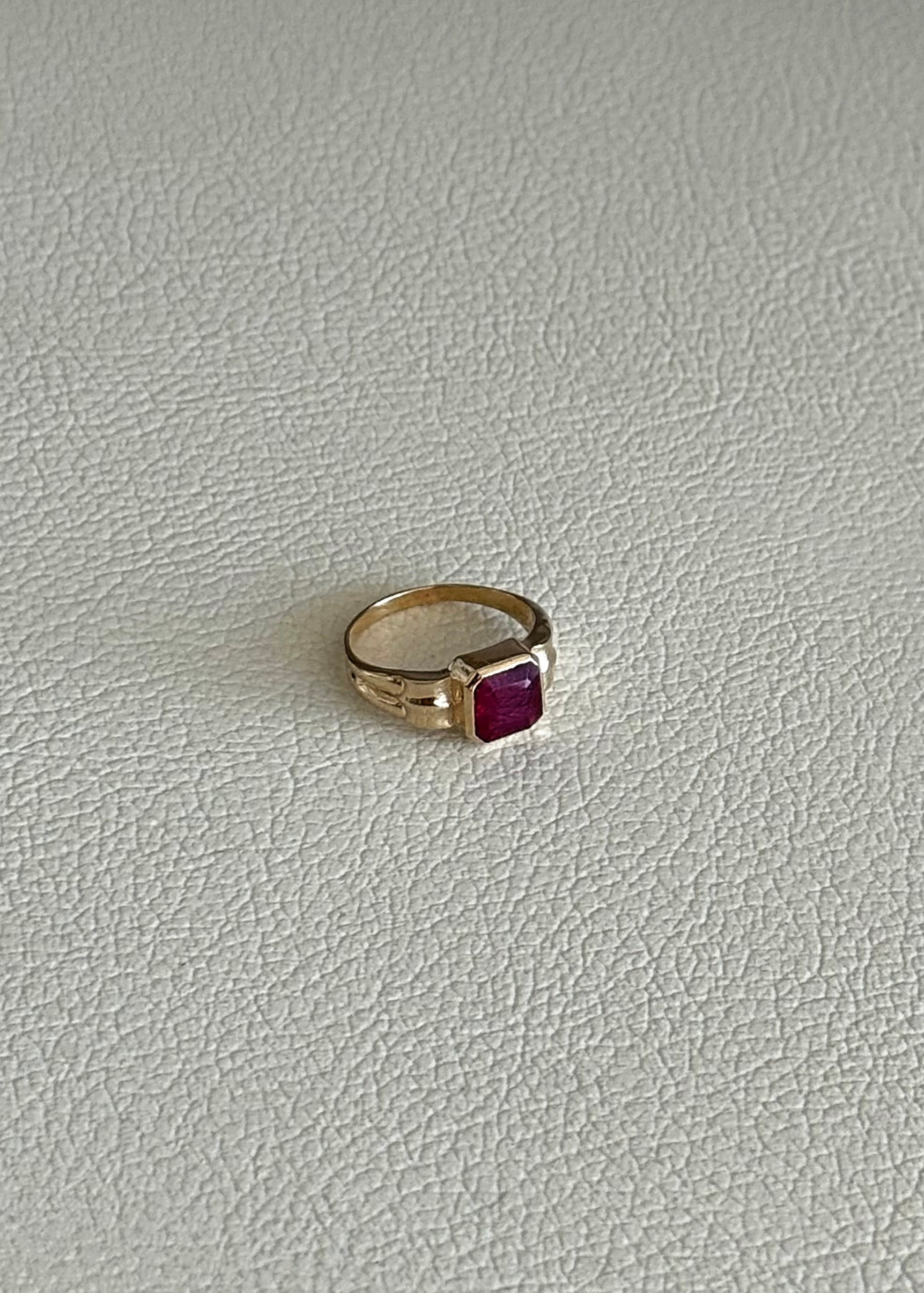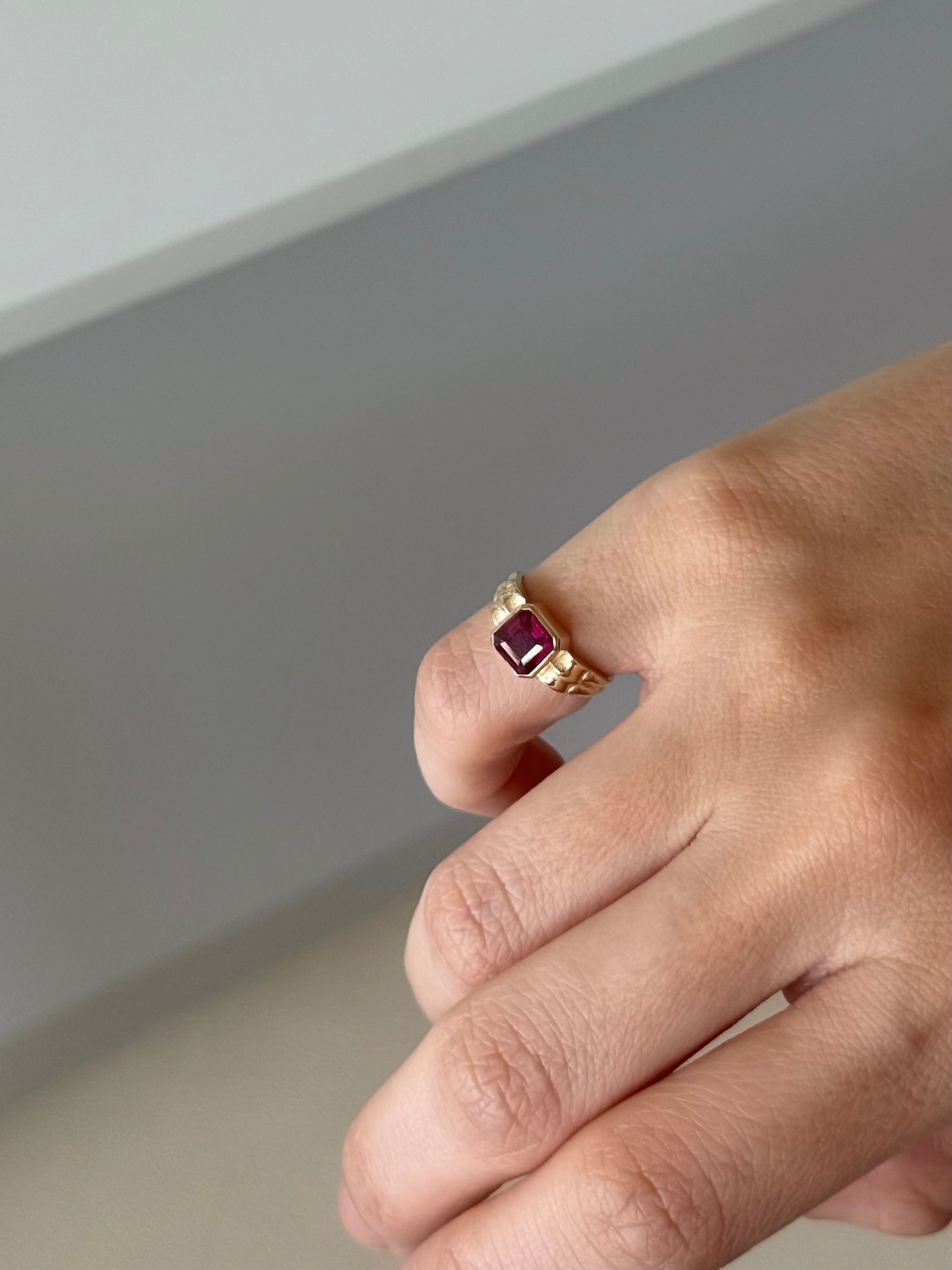 14 Ayar Altın, sekizgen kesim Lab Grown Yakut taşlı, el işçiliği ile tasarlanmış serçe parmak yüzüğü.