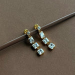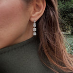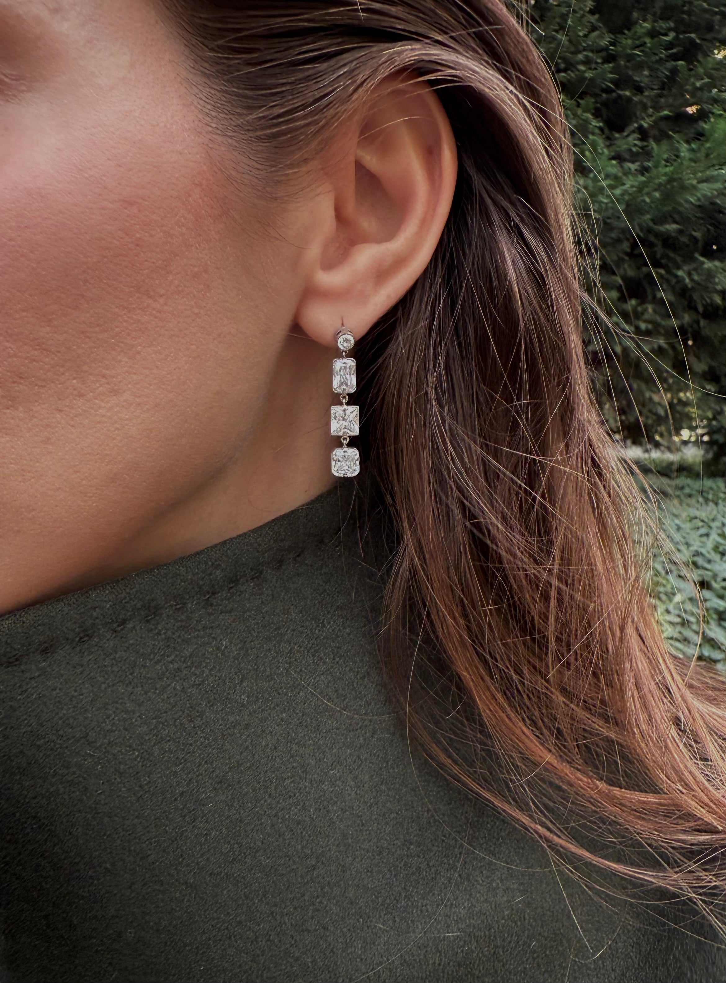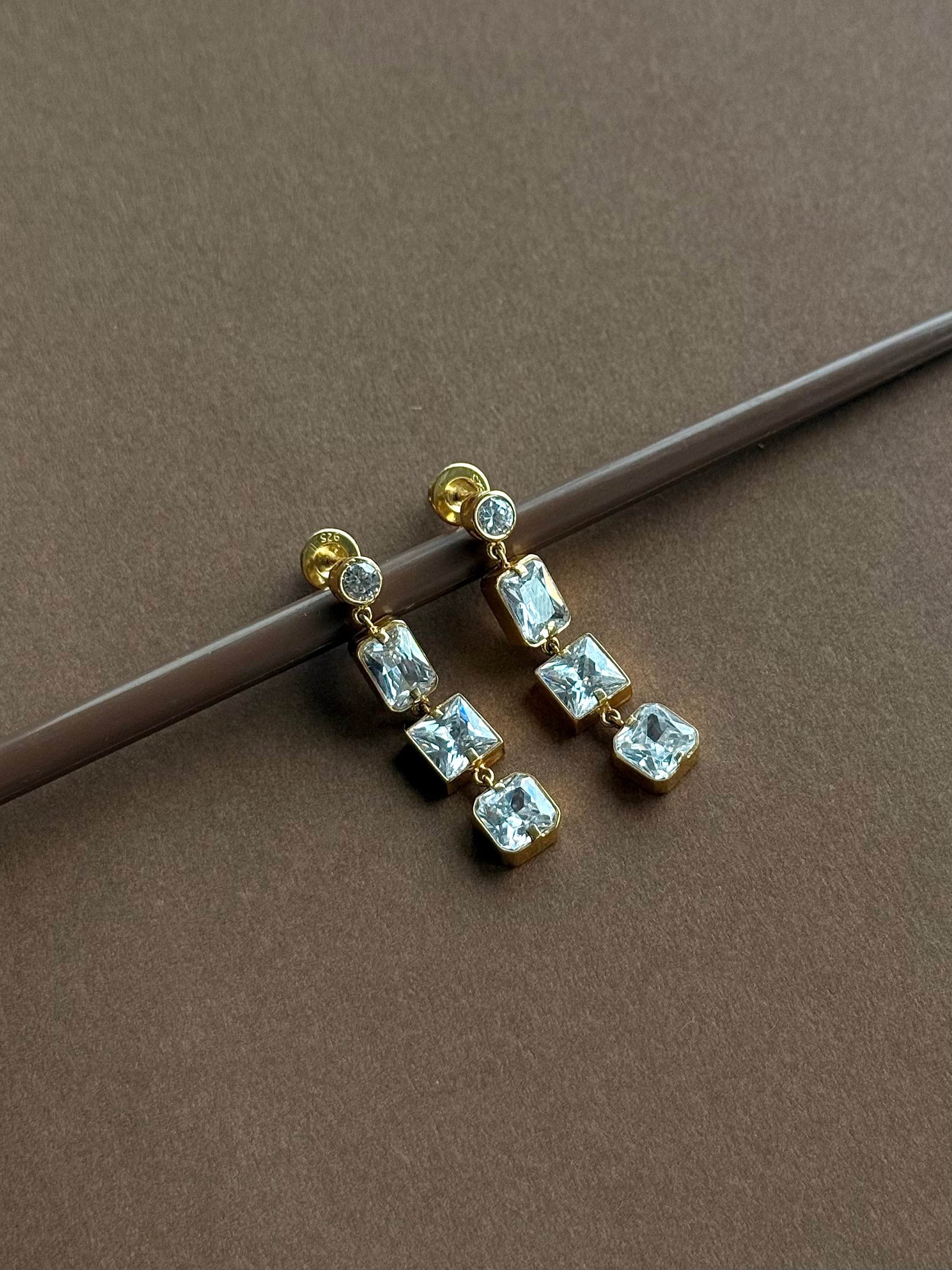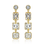 Yuvarlak, Baget, Prenses ve Cushion kesim Swarovski taşlarla el işçiliği ile tasarlanmış. 925 Ayar Gümüş üzeri 18 Ayar Altın mikron kaplama sallantılı küpe.