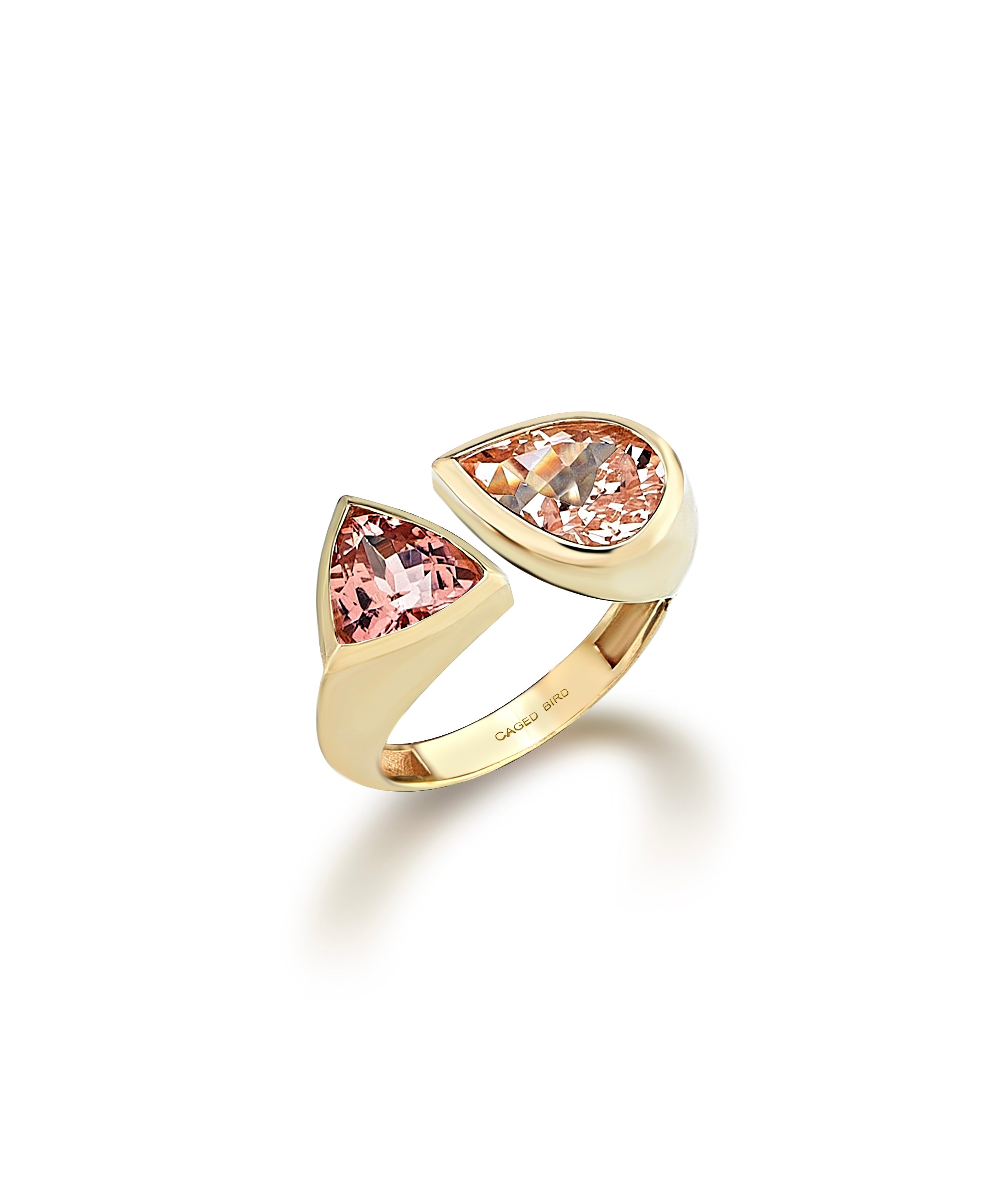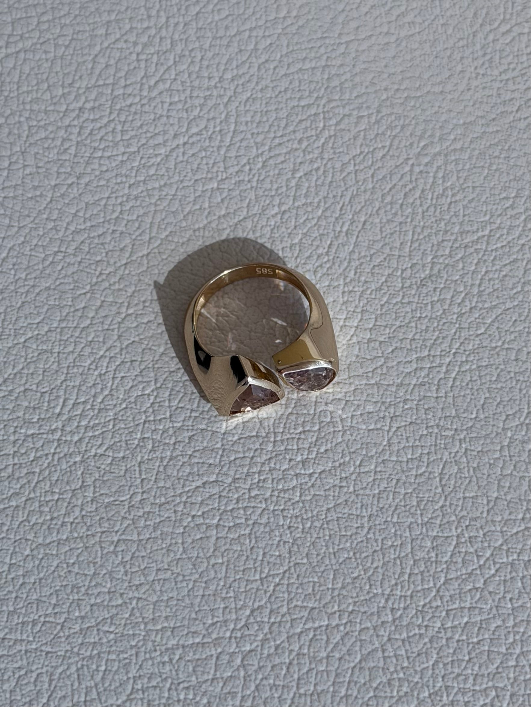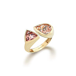 Trillion ve damla kesim pembe renklerde Turmalin taşlarıyla tasarlanmış 14 ayar altın Moi et Toi yüzük. Parmakta yüksek ve volümlü form. Tamamı el işçiliğiyile üretilmiştir.