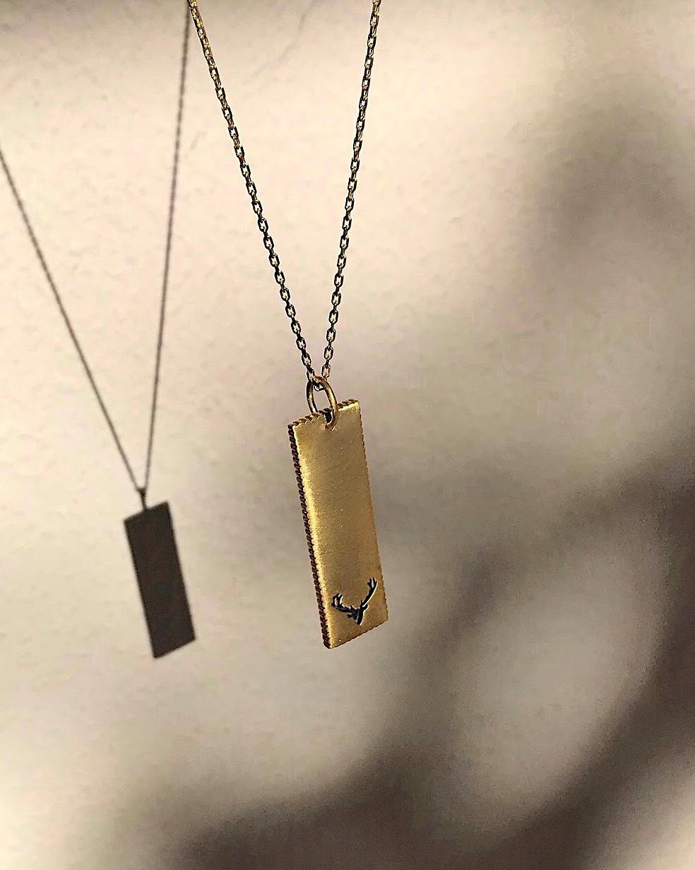 El işçilişiyle tasarlanmış, 925 ayar gümüş kolye. Özel yarı mat yarı parlak Grose cila tekniği, ve siyah mine kullanılmıştır.