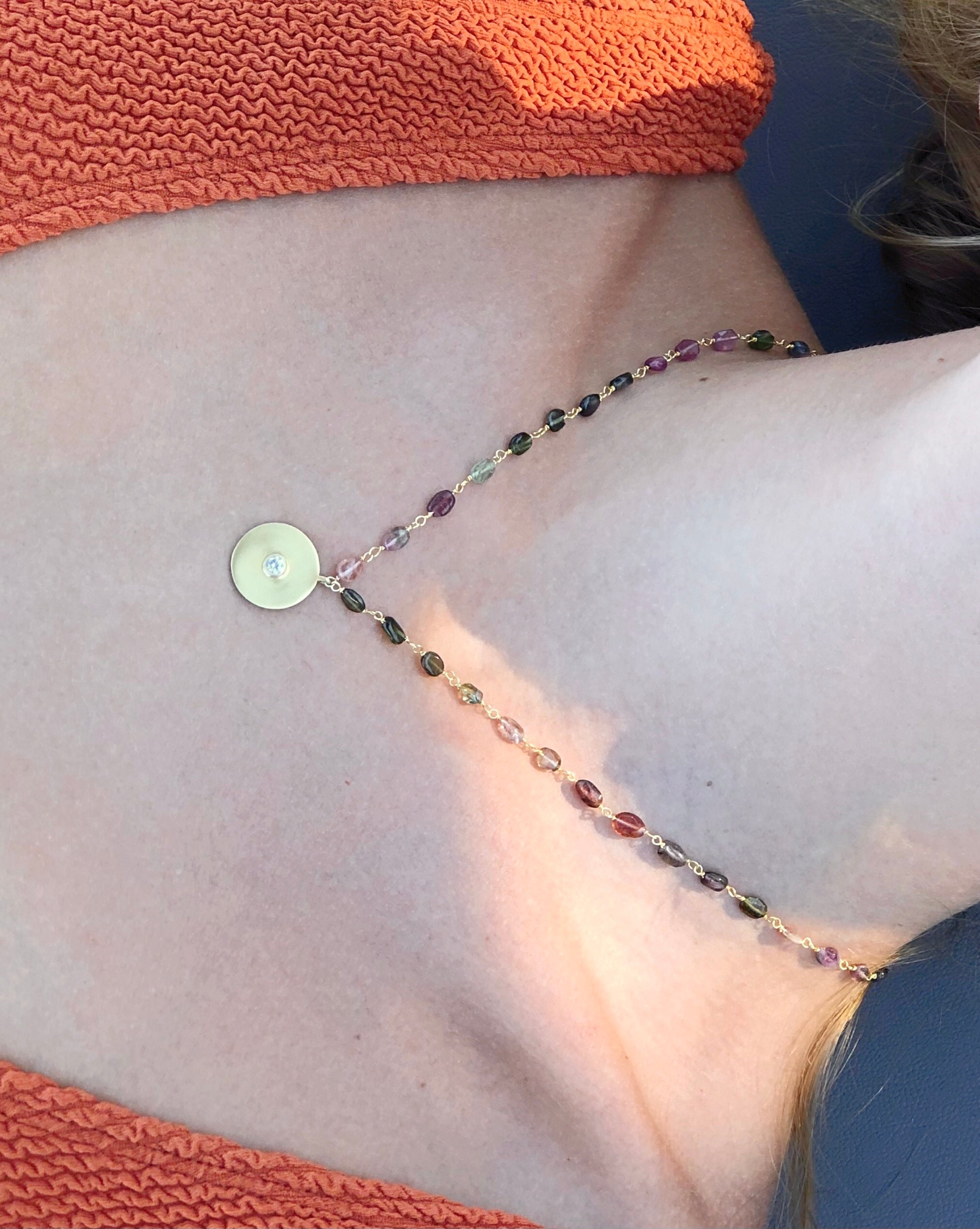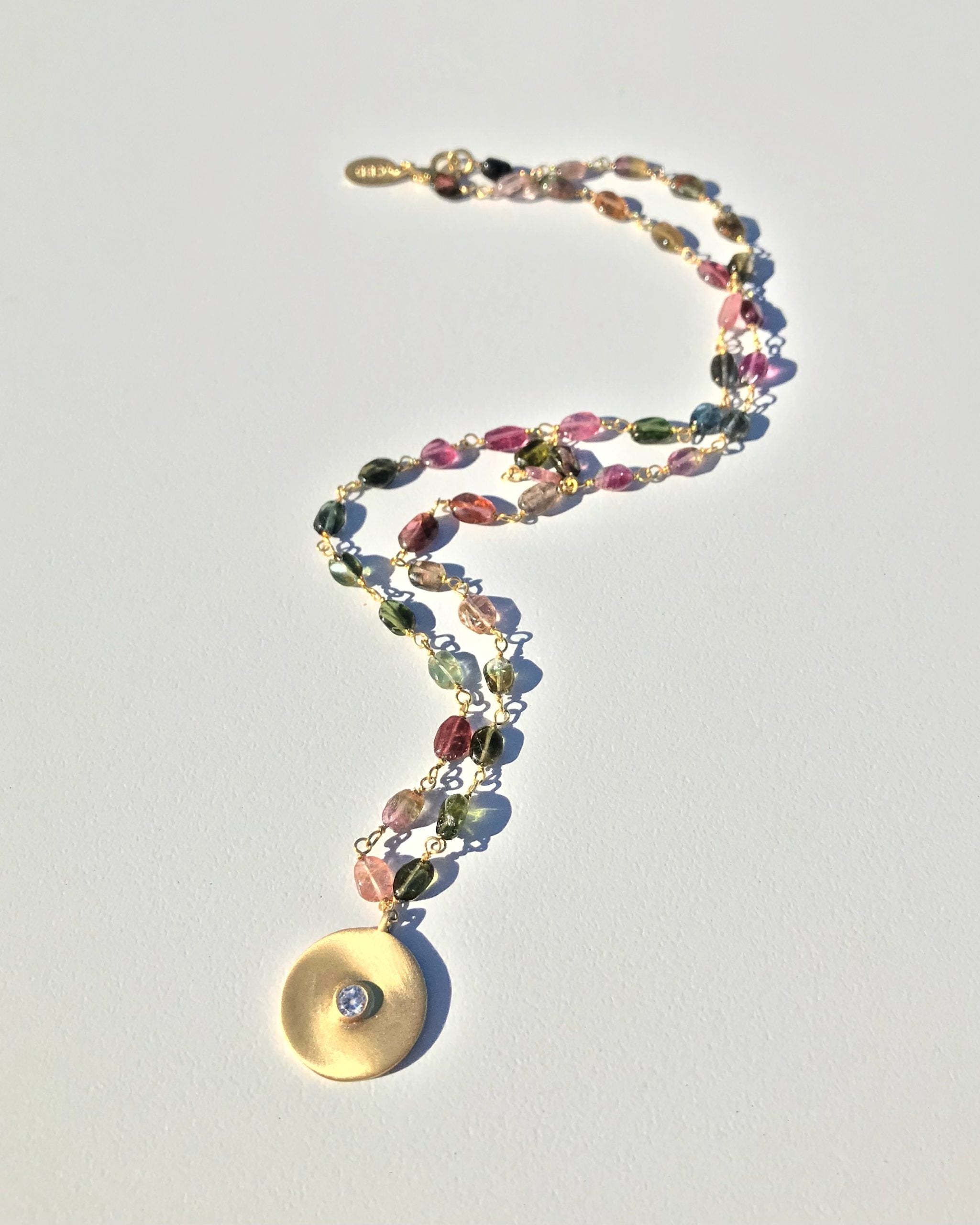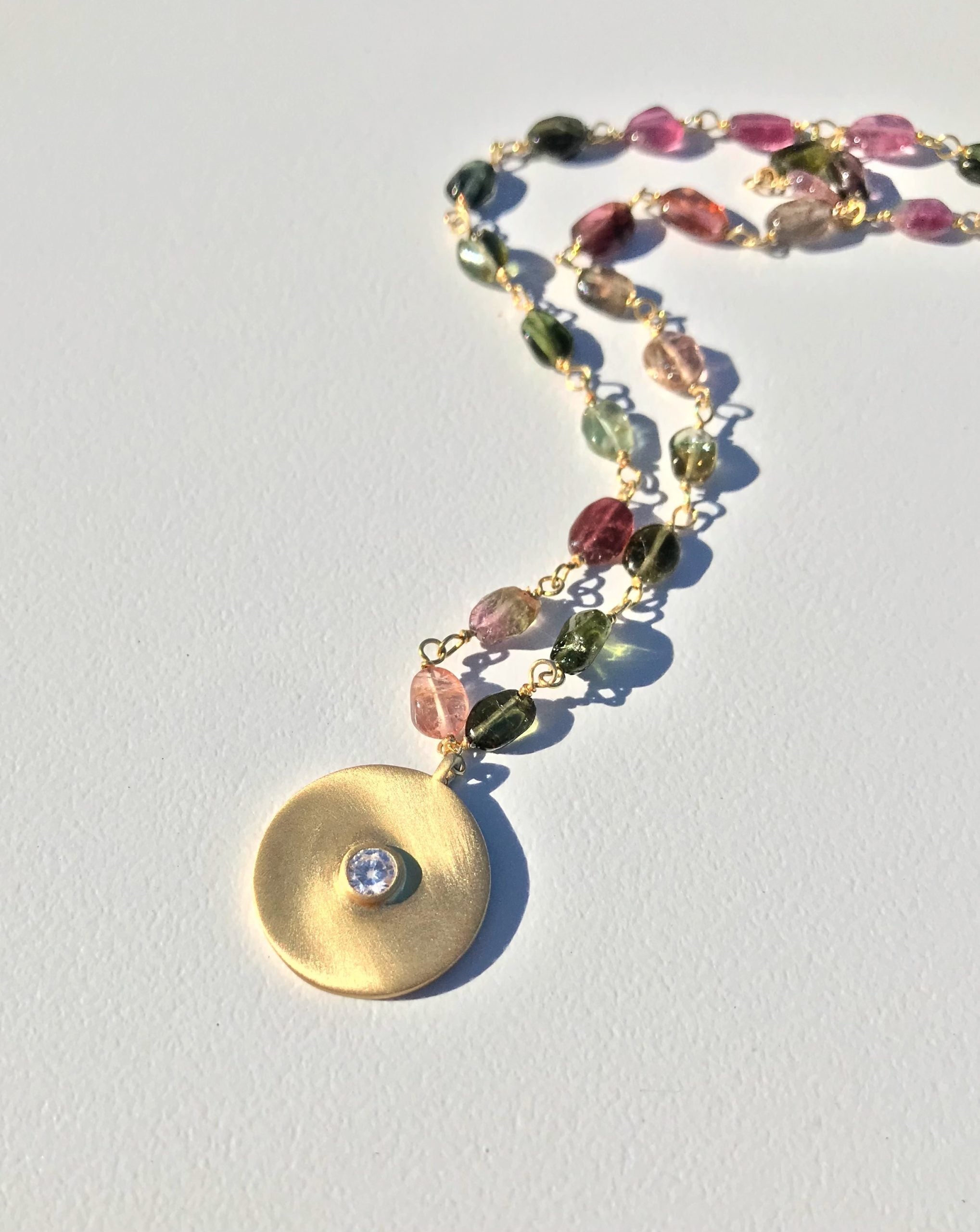 Turmalin taşlarla tasarlanmış; tek Swarovski taşlı uç, el yapımı Gümüş üzeri 18 Ayar Altın Kaplama Kolye.