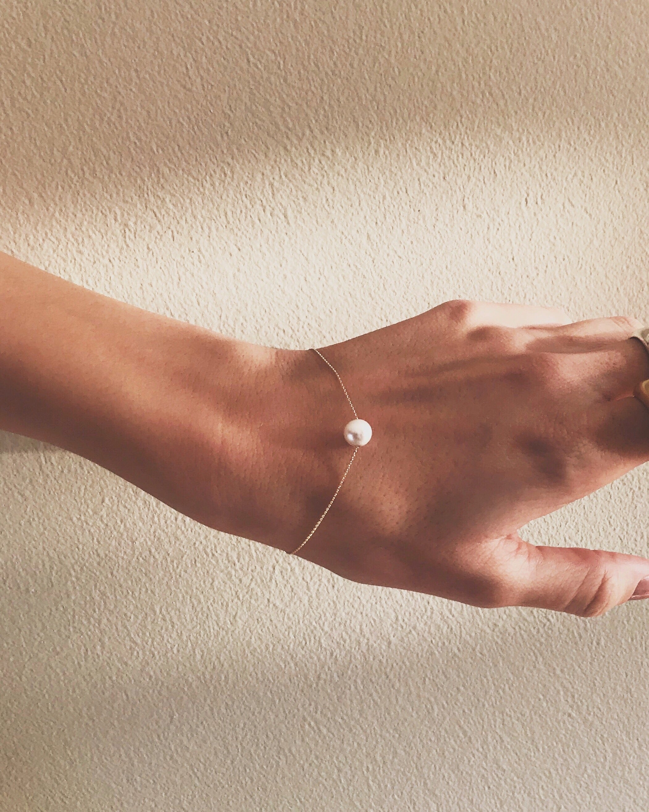 14 Ayar Altın zincir ve tek hareketli incili zarif bileklik. Tüm tasarımlarımızda gerçek tatlı su incileri kullanılmaktadır.