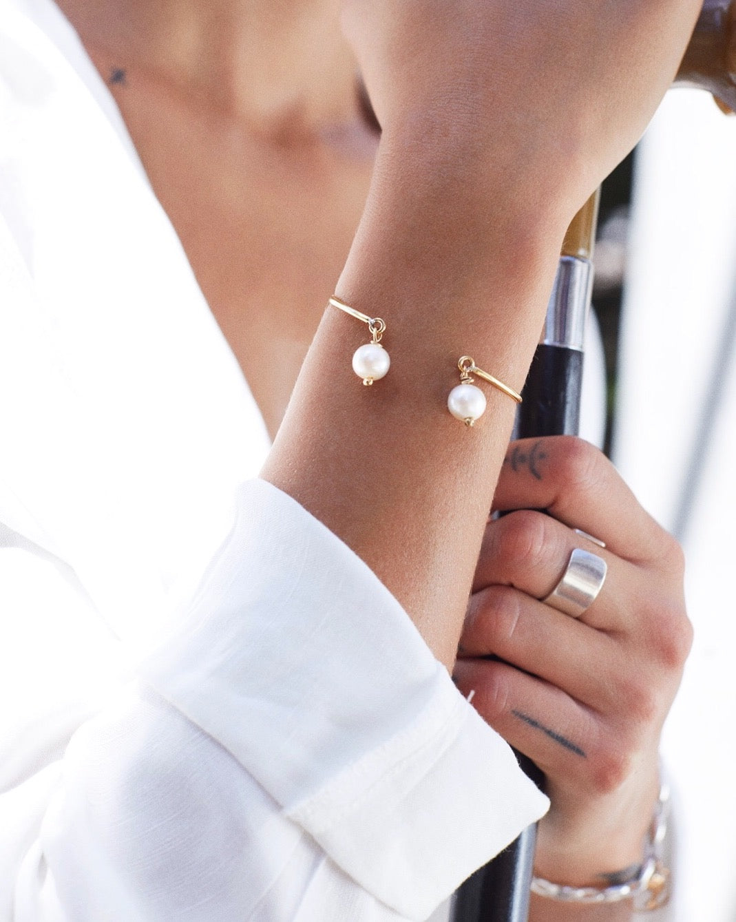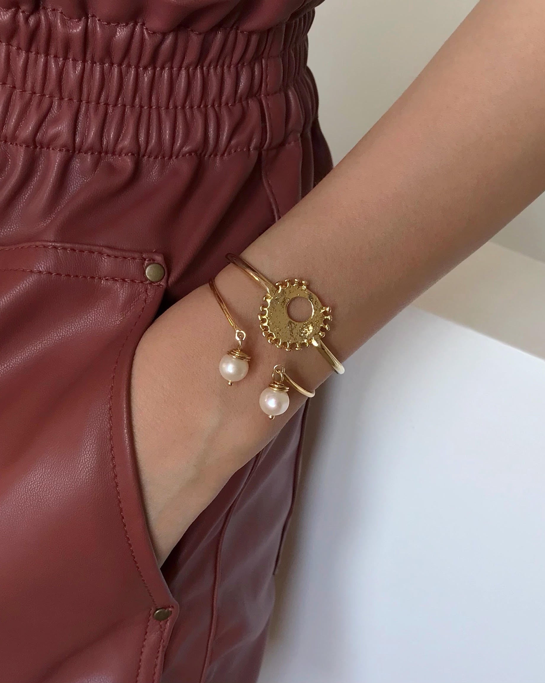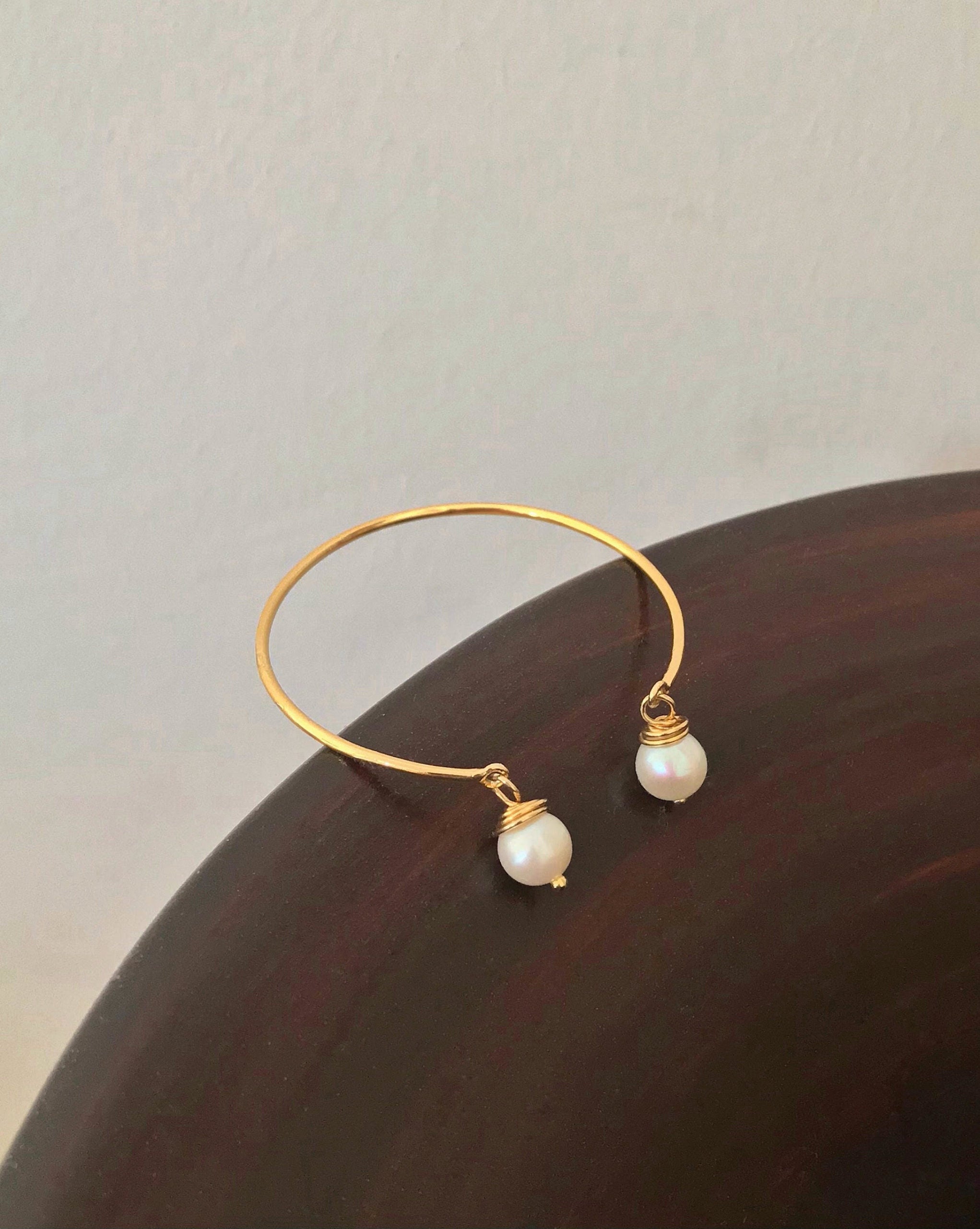 El yapımı bronz üzeri 18 Ayar Altın mikron kaplama inci sallantılı bileklik